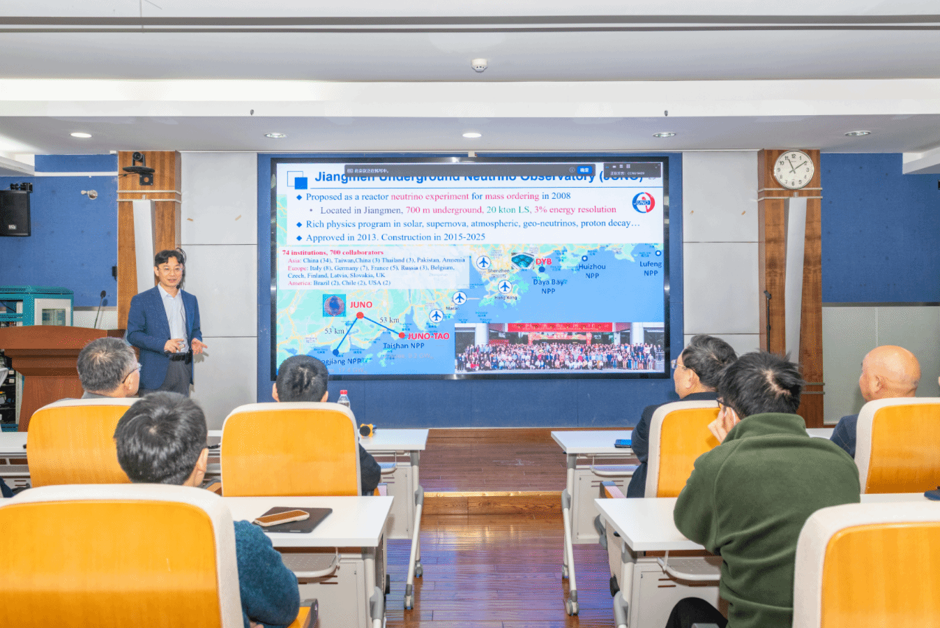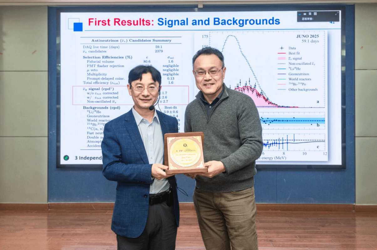 In his report, Professor Cao systematically introduced the ten-year journey of JUNO from its proposal and construction to the acquisition of the first scientific results. As the first completed and operational facility among the three major next-generation neutrino experiments worldwide, JUNO is located 700 meters underground, features a core detector of 20,000 tons of liquid scintillator, and officially began scientific data collection on August 26, 2025. Professor Cao specifically highlighted that in the initial results released on November 19, JUNO improved the measurement precision of the neutrino mixing parameters sin²θ₁₂ and Δm²₂₁ by factors of 1.5 and 1.8, respectively, setting the best measurement records in this field over the past 50 years.